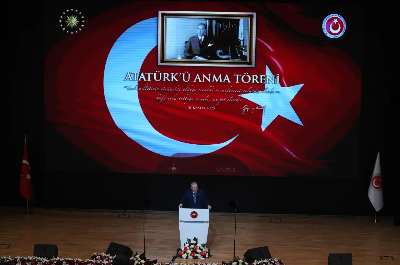 Burada konuşan Erdoğan, Cumhuriyetin banisi Gazi Mustafa Kemal Atatürk'ü, vefatının 87'nci seneyi devriyesinde saygıyla andı, milletin şeref nişanesi olan İstiklal Harbi'ni sevk ve idare ederek yeni devleti kuran Gazi Meclis'in tüm üyelerini şükranla yad etti.