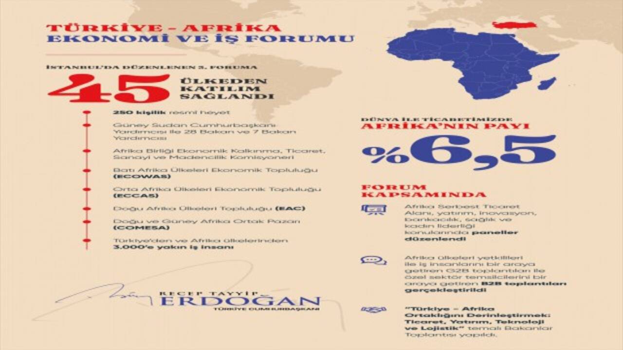 Paylaşımında bir infografiğe de yer veren Erdoğan, kendisinin de konuşma yaptığı Türkiye-Afrika Ekonomi ve İş Forumu'na 45 ülkeden katılım sağlandığını belirtti.