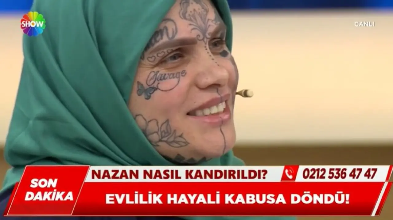 Nazan, programa yaptığı açıklamada evlilik vaadiyle kandırıldığını iddia etti. Canlı yayında yaşadıklarını anlatan Nazan’ın yüzündeki dövmeler dikkat çekerken, sunucu Didem Arslan Yılmaz dövmelerin anlamını sordu.