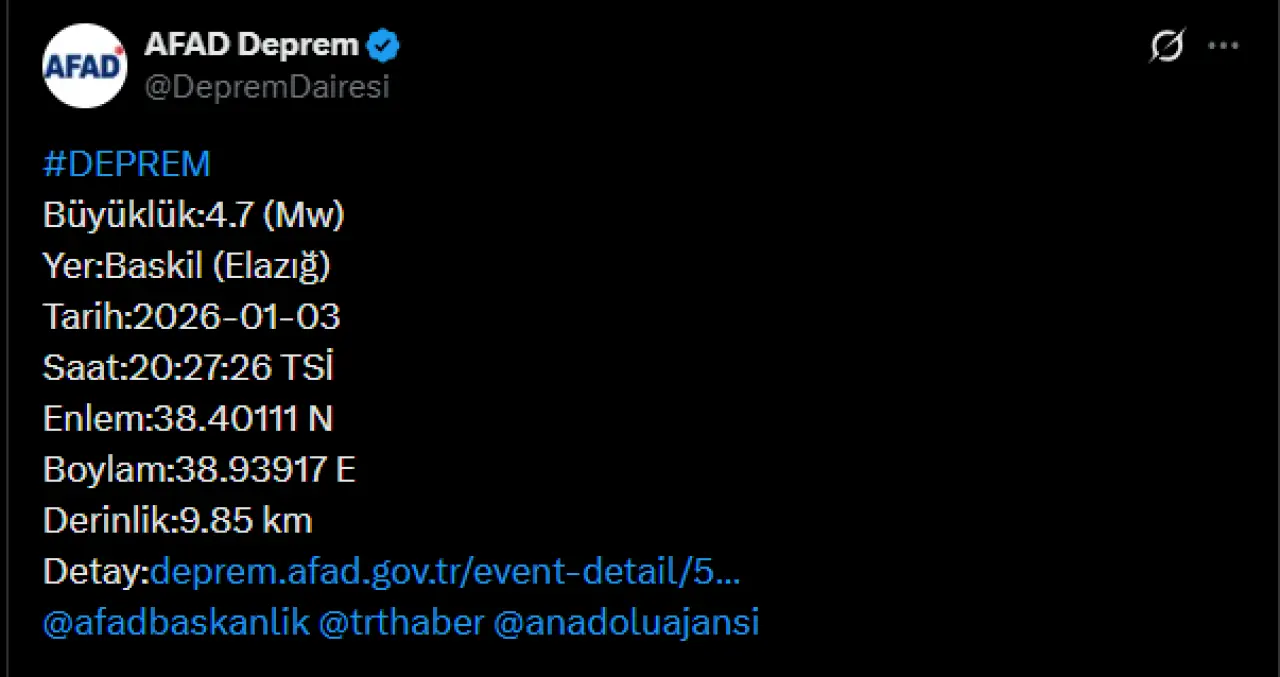 Elazığ Valiliği'nden yapılan açıklamada, "İçişleri Bakanlığı Afet ve Acil Durum Yönetimi Başkanlığı'ndan alınan bilgiye göre; Baskil ilçemizde 3 Ocak 2026 tarihinde saat 20.27'de 4.7 büyüklüğünde deprem meydana gelmiştir. Meydana gelen deprem sonrasında ilimizdeki AFAD, 112 ihbar hatlarına herhangi bir hasar ihbarı yapılmamıştır. Bütün birimlerimiz depremin ilimizdeki etkilerini yakından takip etmektedir" denildi.