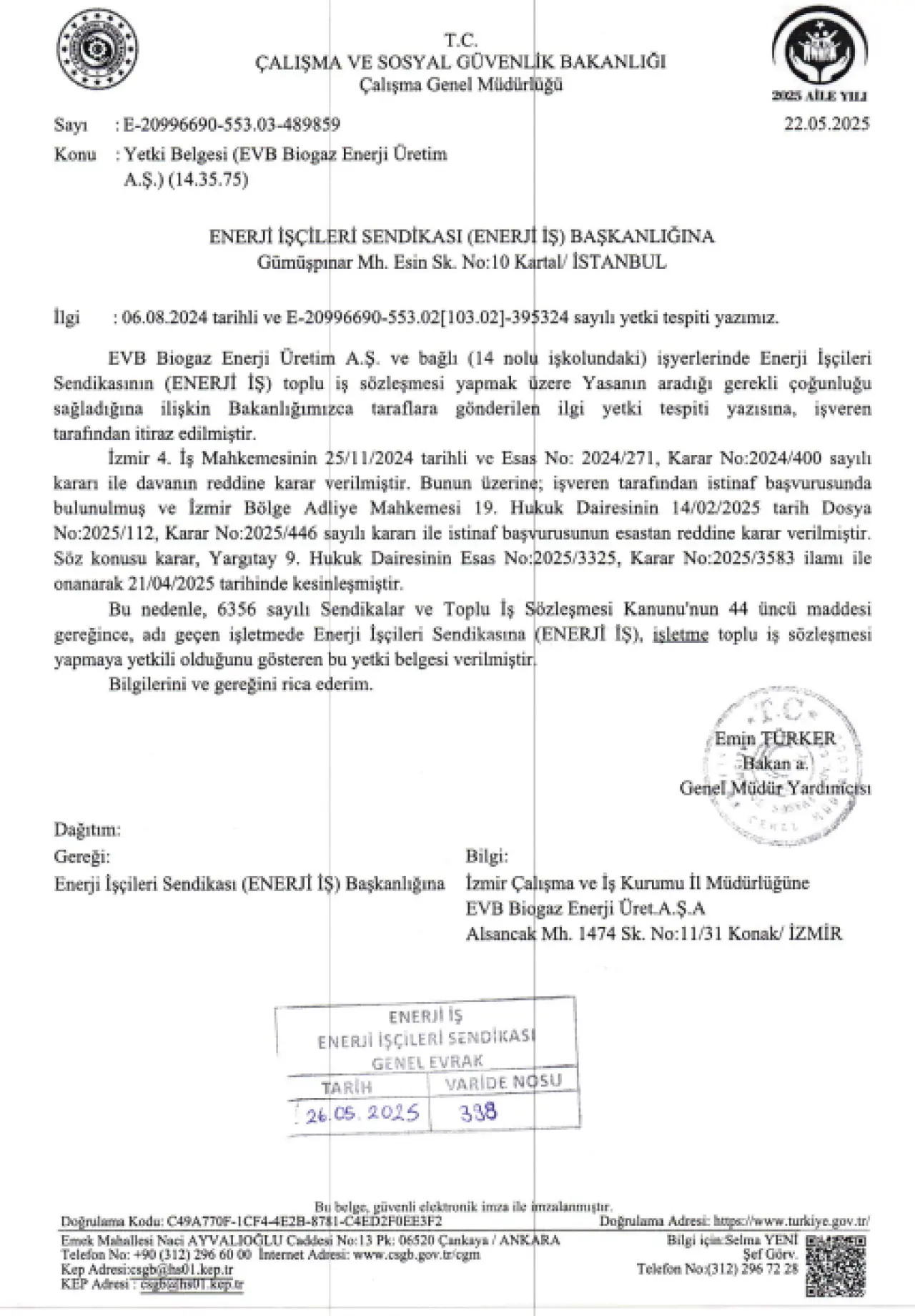 İzmir 4. İş Mahkemesinin 25.11.2024 tarihli kararı ile davanın reddine karar vermiş, bunun üzerine işveren tarafından istinaf başvurusunda bulunulmuştur. İzmir Bölge Adliye Mahkemesi 19. Hukuk Dairesinin 14.02.2025 tarihli kararı ile istinaf başvurusu esastan reddedilmiş söz konusu karar Yargıtay 9. Hukuk Dairesi tarafından 21.04.2025 tarihinde onanmıştır. İlk derece, istinaf ve yargıtay aşamalarının tamamlandığı sürecin akabinde Enerji İş Sendikası'nın yetki davasını kazandığı, EVB Biogaz’da yetkili sendika olduğu sonucu çıktı.