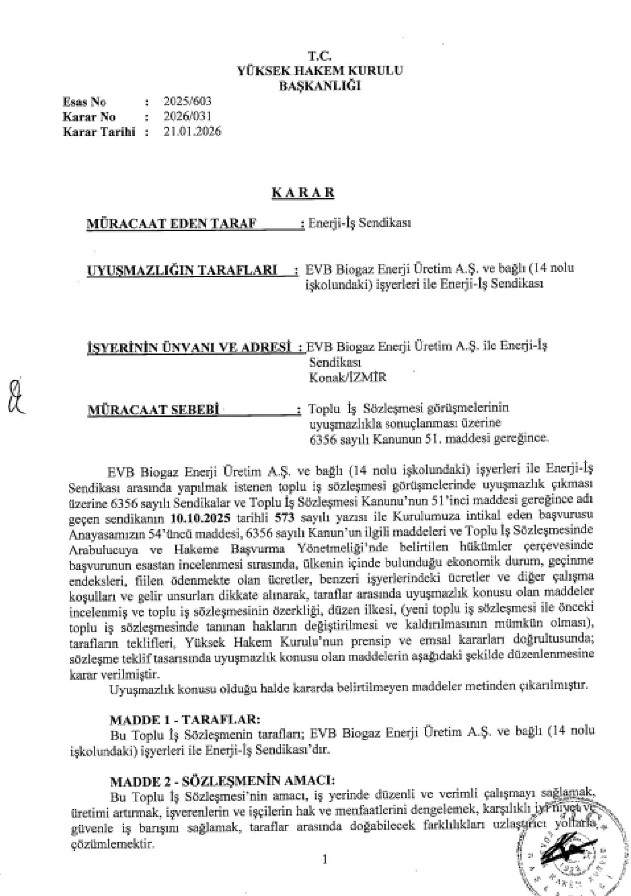 İşçilerin taleplerine yönelik işverenin eli boş halde masaya oturmasının ardından sendika tarafı, üyelerinin isteği doğrultusunda Yüksek Hakem Kurulu’na başvurdu. Yüksek hakem kurulu tarafından 21.01.2026 tarih ve 2026/031 Sayılı karar ile Toplu İş Sözleşmesi hükmünde karar verildi. Bu karar ile Enerji İş Sendikası üyeleri yevmiye zammı, ikramiye, bayram yardımı, yakacak yardımı, direksiyon primi, çocuk yardımı, yemek yardımı, öğrenim yardımı, askerlik yardımı, gece çalışması ücreti, fazla çalışma ücreti, hafta tatili ücreti ve sair ücretlerini geriye dönük ödeme alacak olup bunlara ek olarak yıllık izin günleri ve kıdem tazminatına esas hesaplamalarında da ciddi artışlar yaşanmıştır.