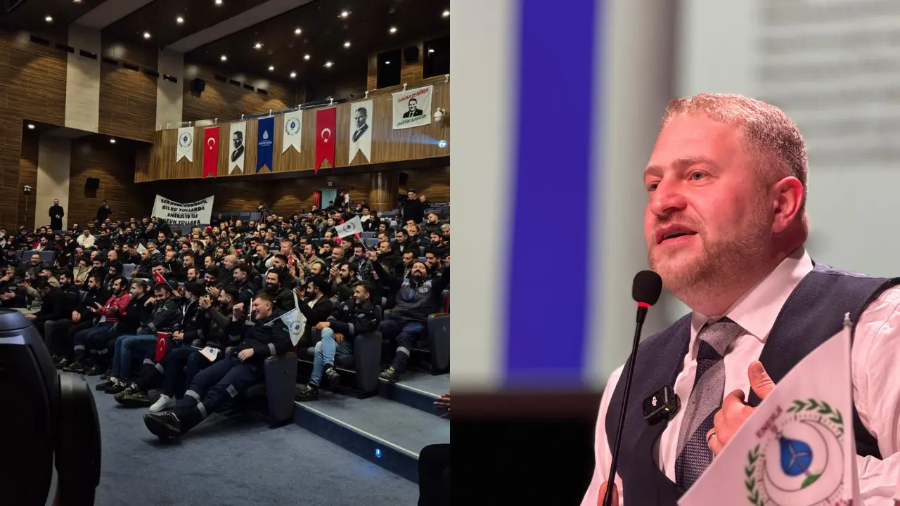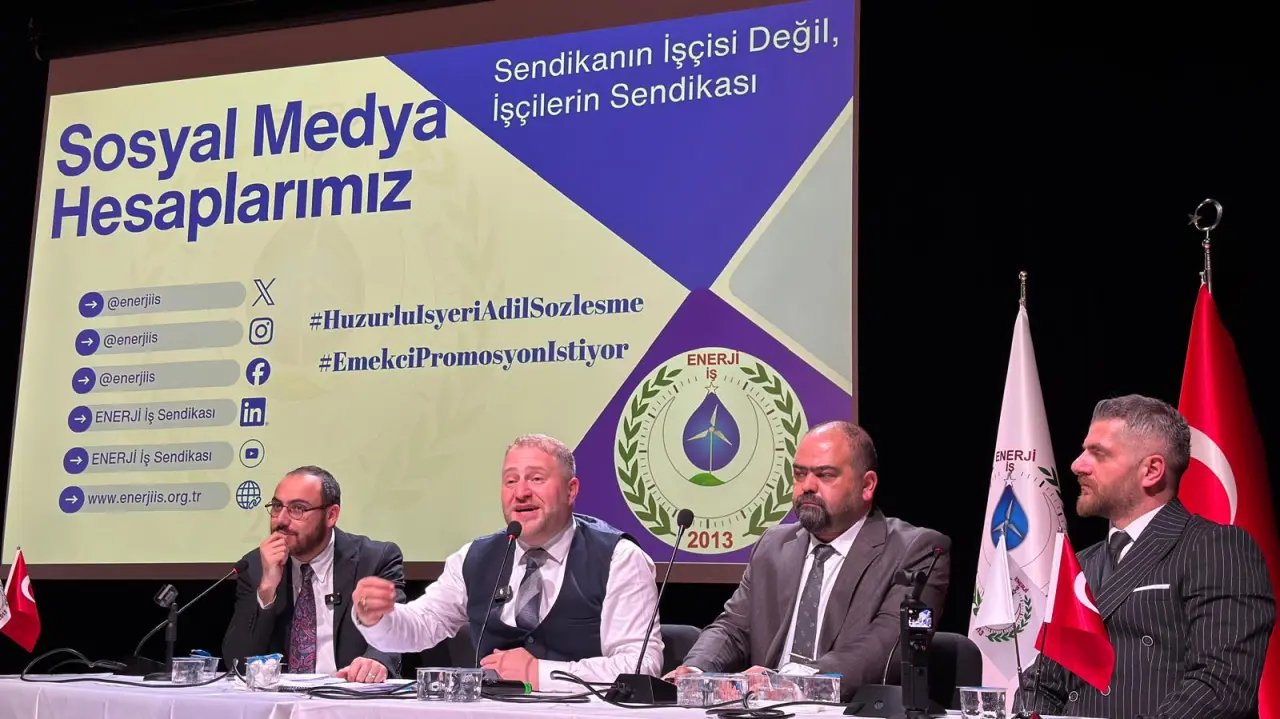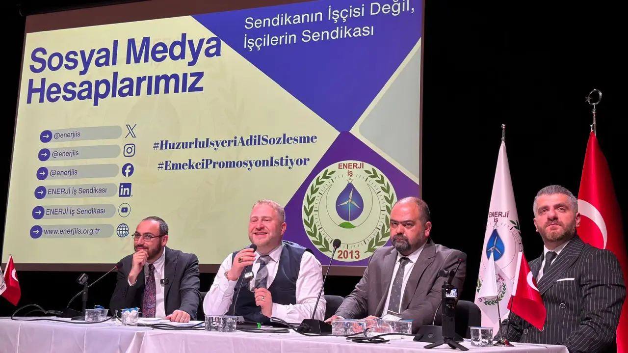 Program öncesi sahneye pankartlarla çıkan işçiler, telefon ışıkları ve sloganlarla salonu adeta bir bayram yerine çevirdi. İşçiler, sahadaki zorlukları ve taleplerini yansıtan; “İşçiye zulme son!”, “Voltaj yüksek maaş düşük, sistemde kaçak var!”, “Beraber yürüdük biz bu yollarda, Enerji İş ile uzun yollara” ve “Gece gündüz arıza bakım, tek istediğim geçim hakkım” yazılı pankartlarla sahneye çıkarak kararlılıklarını gösterdiler.