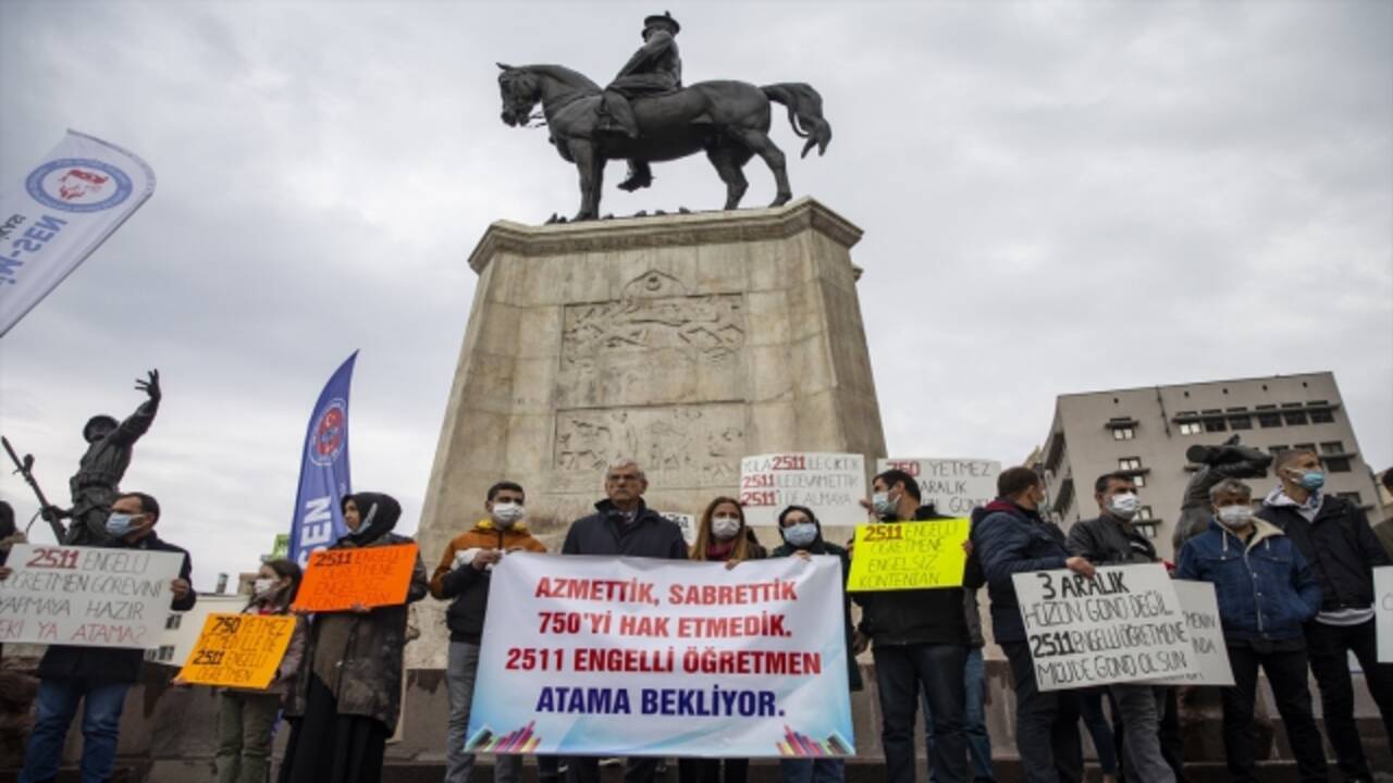 Ulus Meydanı'nda toplanan sendika üyeleri ve yakınları, "Azmettik, sabrettik, 750'yi hak etmedik. 2511 engelli öğretmen atama bekliyor" yazılı pankart açtı.