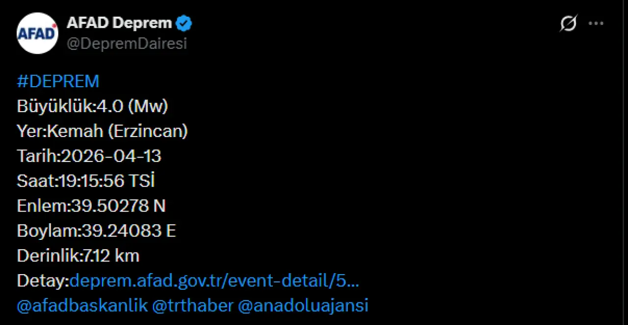 Afet ve Acil Durum Yönetimi Başkanlığı (AFAD) tarafından yapılan açıklamaya göre Erzincan’da merkez üssü Kemah ilçesi olan 4.0 büyüklüğünde bir deprem meydana geldi. Yerin 7.12 kilometre derinliğinde gerçekleşen sarsıntı nedeniyle olumsuz bir durum yaşanmadı.