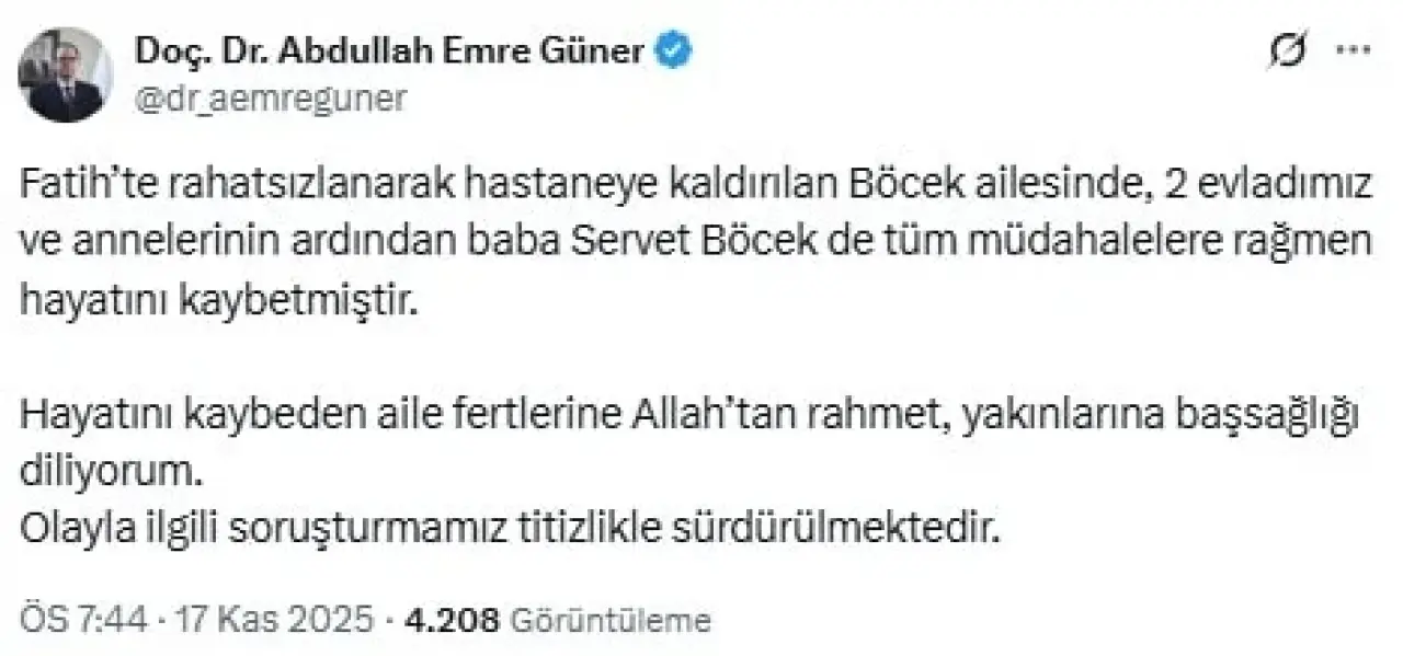 Zehirlenme olayının ardından 6 gündür yoğun bakımda tedavi altına alınan baba Servet Böcek'in ölüm haberini, İstanbul İl Sağlık Müdürü Abdullah Emre Güner duyurdu. Sosyal medya hesabından paylaşım yapan Güner, şu ifadelere yer verdi: