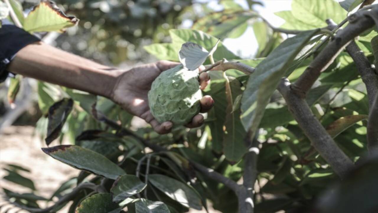 Filistinli genç, bakımı dikkat ve zahmet isteyen tropik meyveyi ailesiyle birlikte yetiştirerek kazanç sağlamaya çalışıyor.