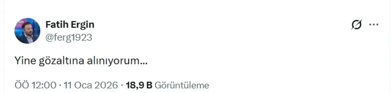Gazeteci Fatih Ergin, sosyal medya hesabından yaptığı paylaşımda, gözaltına alındığını duyurdu. Ergin'in hangi suçlamayla gözaltına dair henüz bir açıklama yapılmadı. Ergin, geçtiğimiz günlerde, ''Halkı yanıltıcı bilgiyi alenen yayma'' suçlamasıyla gözaltına alınmış ve daha sonra serbest bırakılmıştı.