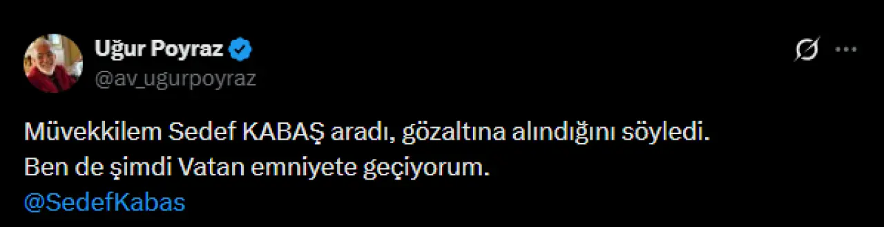 Sedef Kabaş, İstanbul Anadolu Cumhuriyet Başsavcılığı koordinesinde yürütülen soruşturma kapsamında, X platformunda yaptığı paylaşımlar nedeniyle “Cumhurbaşkanına hakaret” ve “suç işlemeye tahrik” suçlamalarıyla gözaltına alındı.