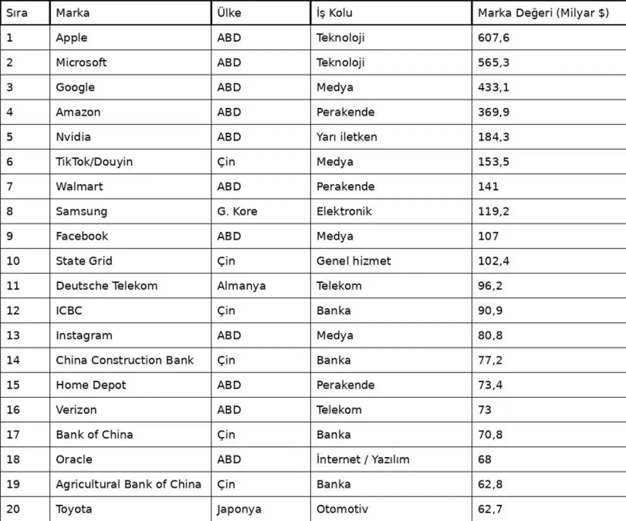Apple’ı, yapay zekaya yaptığı yatırımlarla değer kazanan Microsoft 565,3 milyar dolar ve Google 433,1 milyar dolar ile takip etti. Listenin ilk beşinde ayrıca Amazon (369,9 milyar dolar) ve yarı iletken sektörünün öne çıkan markası Nvidia (184,3 milyar dolar) yer aldı.