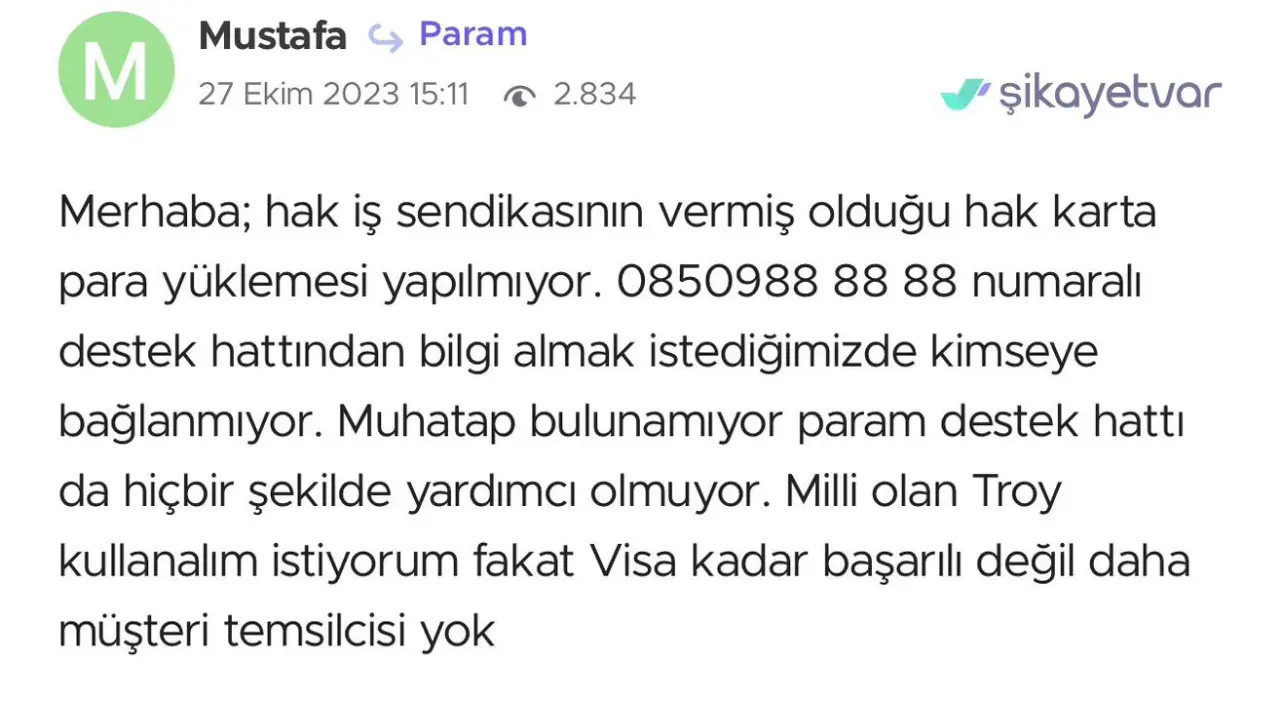 ‘’Merhaba; HAK-İŞ sendikasının vermiş olduğu Hak Kart’a para yüklemesi yapılmıyor. 0850 988 88 88 numaralı destek hattından bilgi almak istediğimizde kimseye bağlanılmıyor. Muhatap bulunamıyor, Param destek hattı da hiçbir şekilde yardımcı olmuyor. Milli olan Troy’u kullanmak istiyorum fakat Visa kadar başarılı değil, hâlâ müşteri temsilcisi yok.''