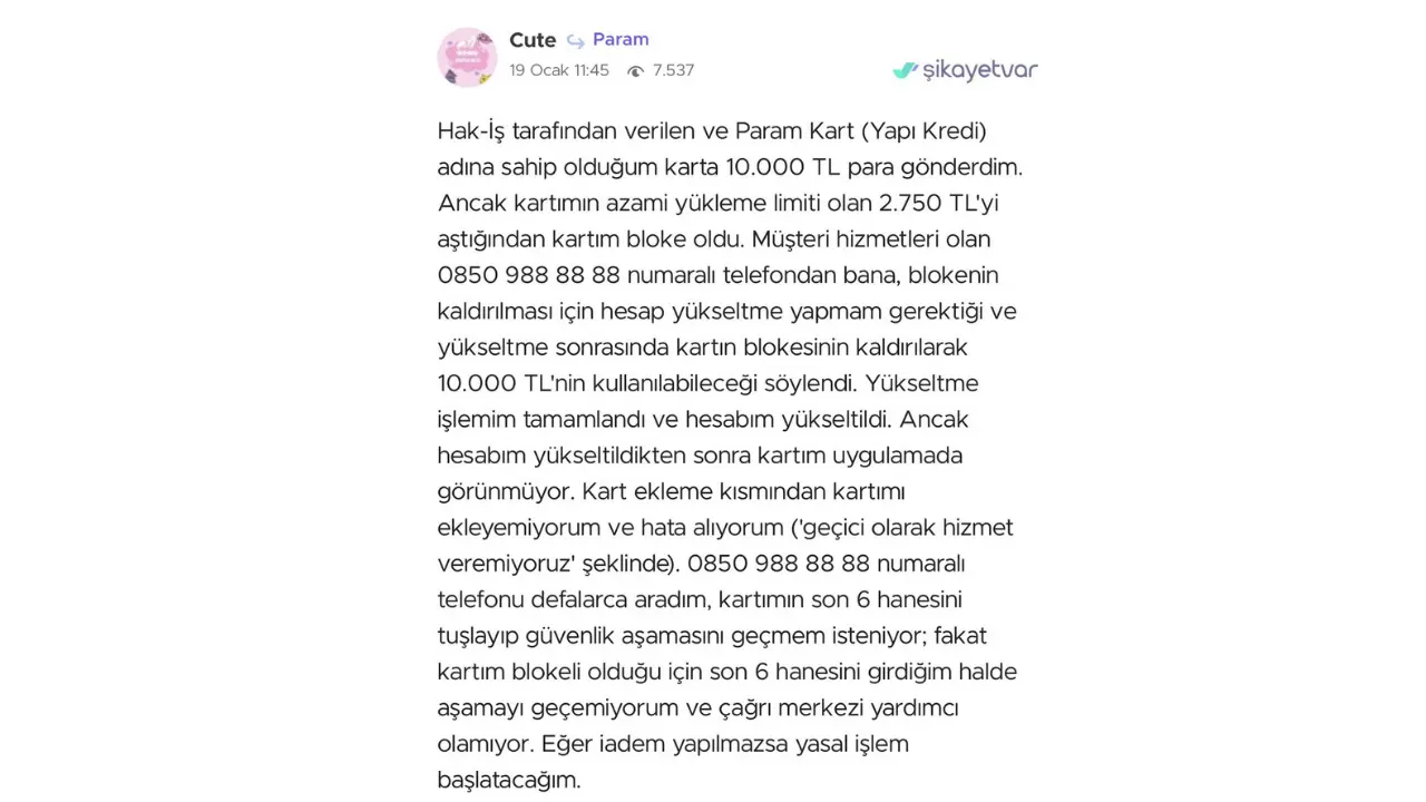 ‘’Hak-İş tarafından verilen ve Param Kart (Yapı Kredi) adına sahip olduğum karta 10.000 TL para gönderdim. Ancak kartımın azami yükleme limiti olan 2.750 TL’yi aştığından kartım bloke oldu.