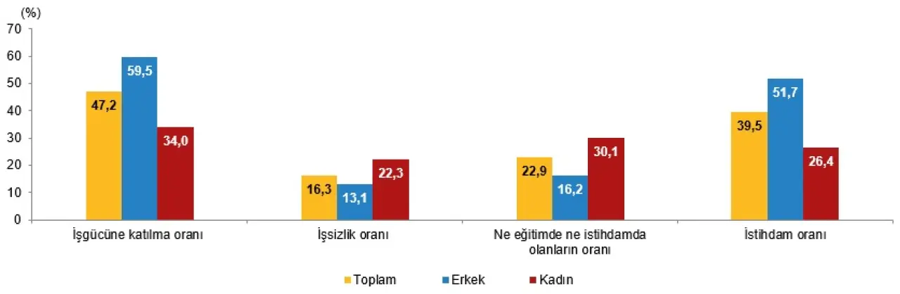 - Gençlerin işgücüne katılım oranı %34,8. Bu, her üç gençten sadece biri ya çalışıyor ya da iş arıyor demektir.