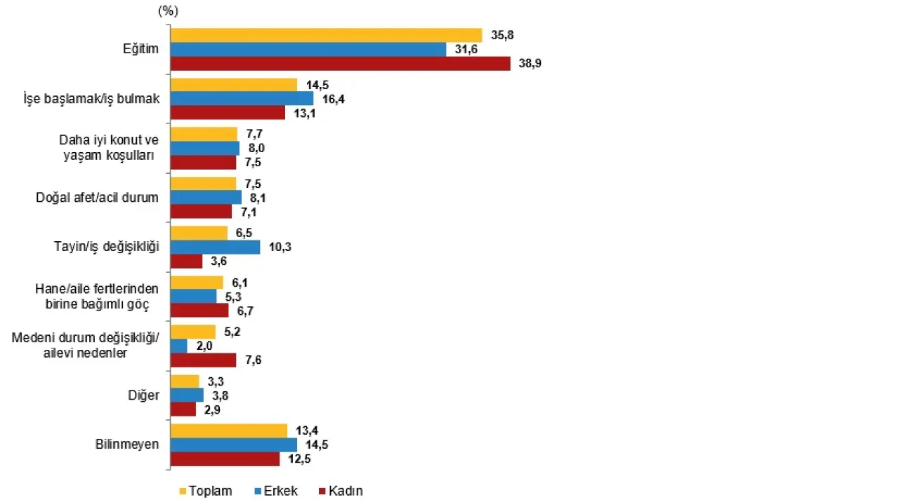 İç Göç İstatistiklerine göre Türkiye'de 2023 yılında en fazla göç hareketliliğinin yaşandığı 20-24 yaş grubunun göç etme nedenleri incelendiğinde; bu hareketliliğin en büyük nedeninin eğitim olduğu görüldü. Gençlerin 231 bin 477'sinin eğitim, 94 bin 139'unun işe başlamak veya iş bulmak ve 50 bin 8'inin ise daha iyi konut ve yaşam koşulları nedeniyle göç ettiği görüldü.