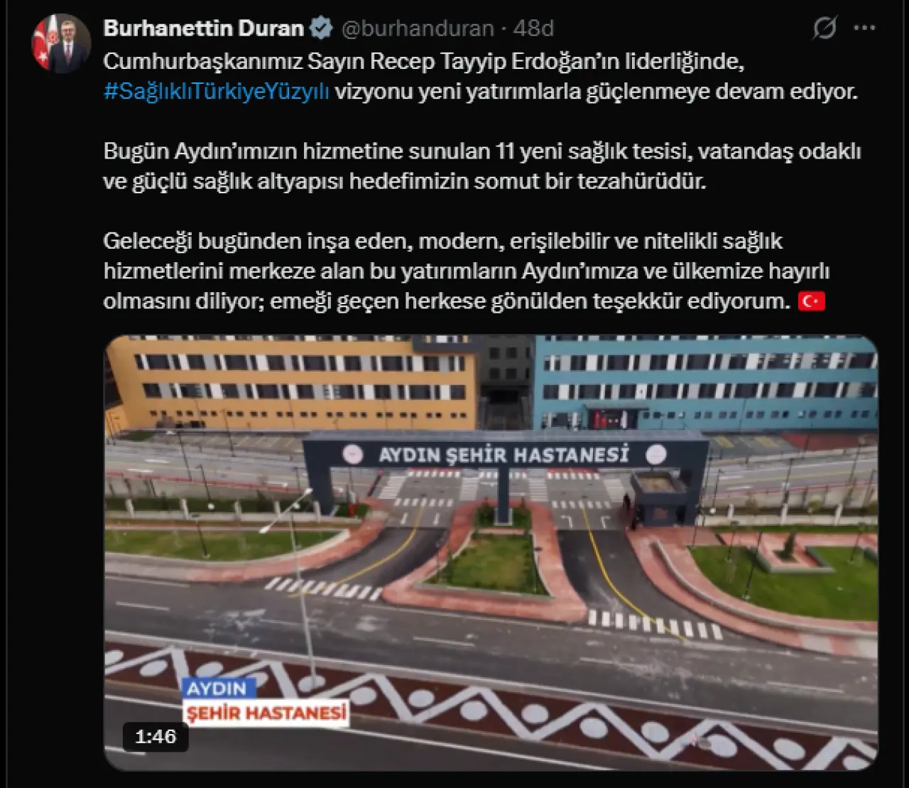 Aydın Şehir Hastanesi'nin açılışına dair paylaşım yapan Cumhurbaşkanlığı İletişim Başkanı Burhanettin Duran, "Bugün Aydın'ımızın hizmetine sunulan 11 yeni sağlık tesisi, vatandaş odaklı ve güçlü sağlık altyapısı hedefimizin somut bir tezahürüdür" ifadelerini kullandı.