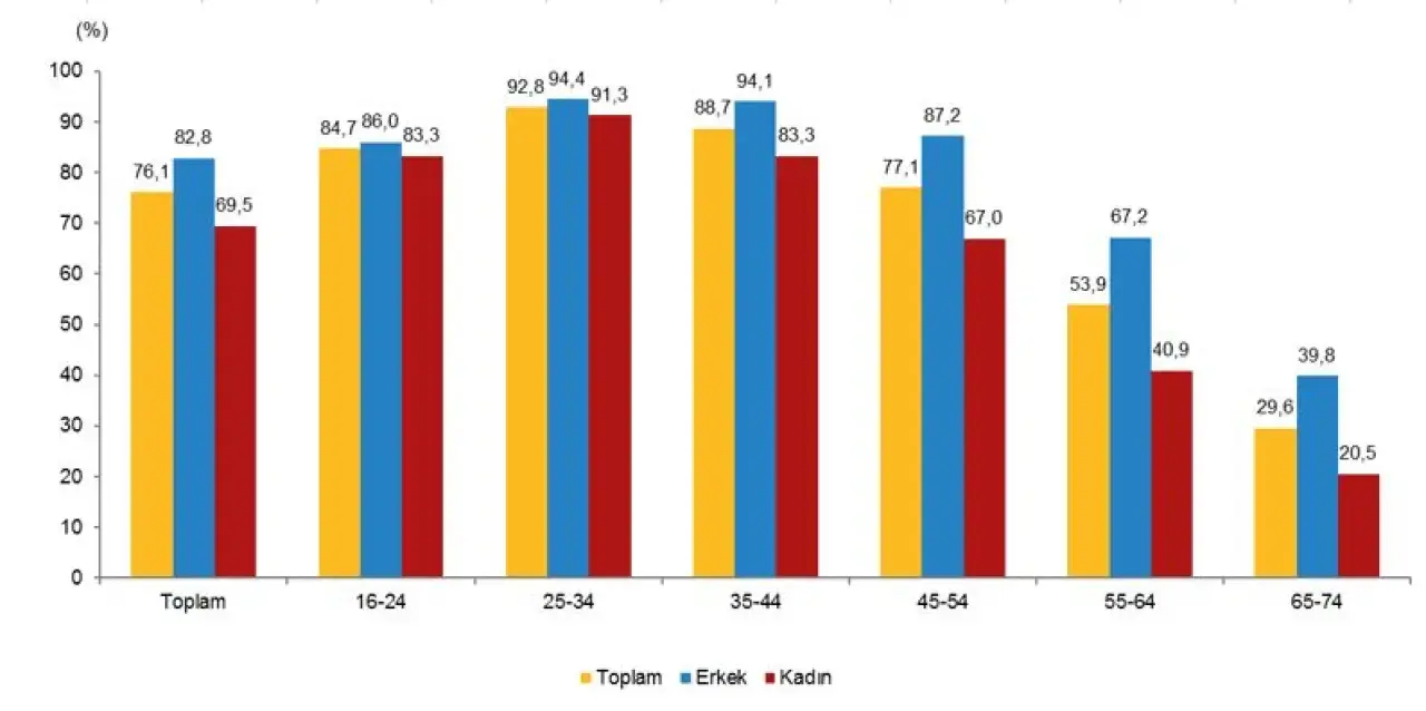 İnternet kullanım oranı, 16-74 yaş grubundaki bireylerde 2024 yılında %88,8 iken 2025 yılında %90,9 oldu. Cinsiyet ayrımında 2025 yılında İnternet kullanım oranı; erkeklerde %93,6, kadınlarda %88,2 olarak gözlendi.