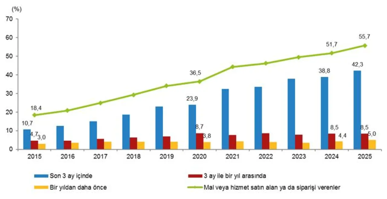 Son 12 ayda İnternet kullanan bireylerin İnternet üzerinden özel kullanım amacıyla mal veya hizmet satın alma ya da sipariş verme (e-ticaret) oranı, 2024 yılında %51,7 iken 2025 yılında %55,7 oldu. Cinsiyete göre İnternet üzerinden mal veya hizmet satın alma ya da sipariş verme oranı erkeklerde %59,1, kadınlarda %52,3 oldu. Bu oran, en son mal veya hizmet satın alma ya da sipariş verme zamanlarına göre incelendiğinde; bireylerin %42,3'ünün son 3 ay içinde (2025 yılı ilk 3 ayı) mal veya hizmet satın aldığı ya da sipariş verdiği görüldü.