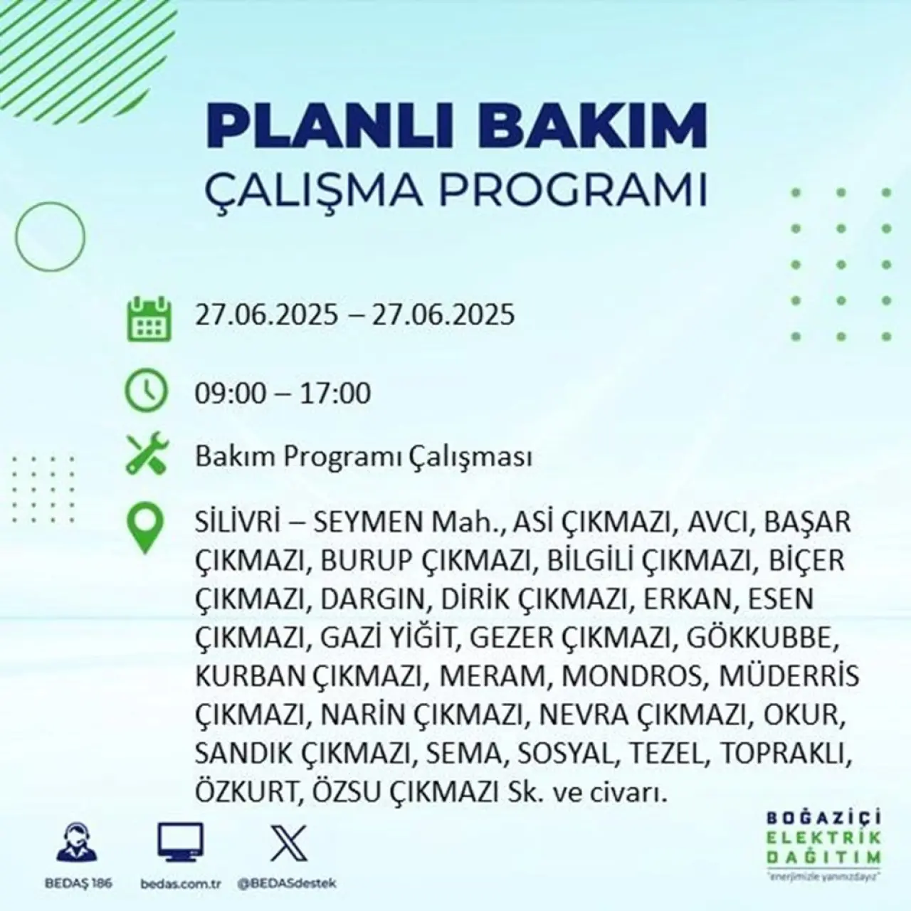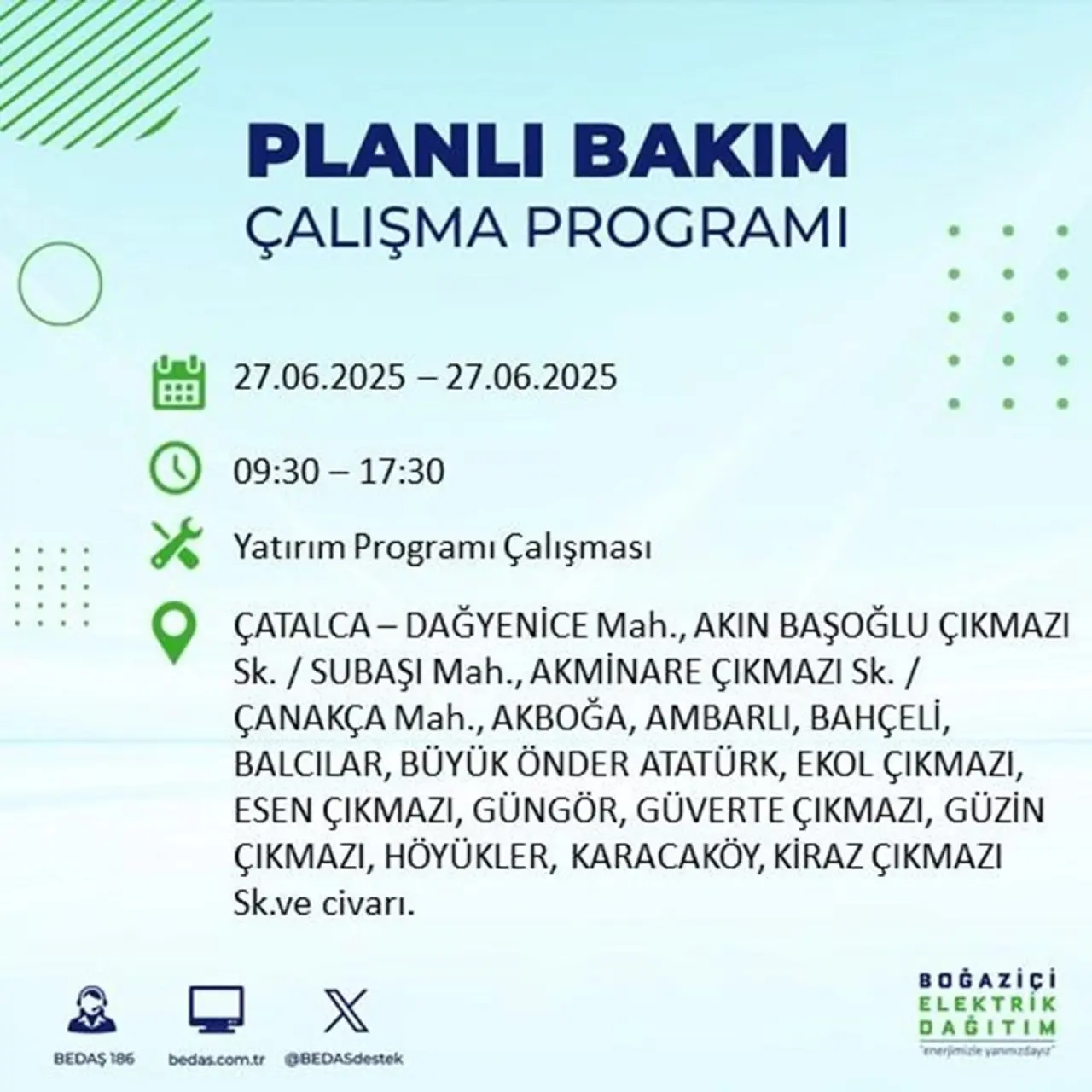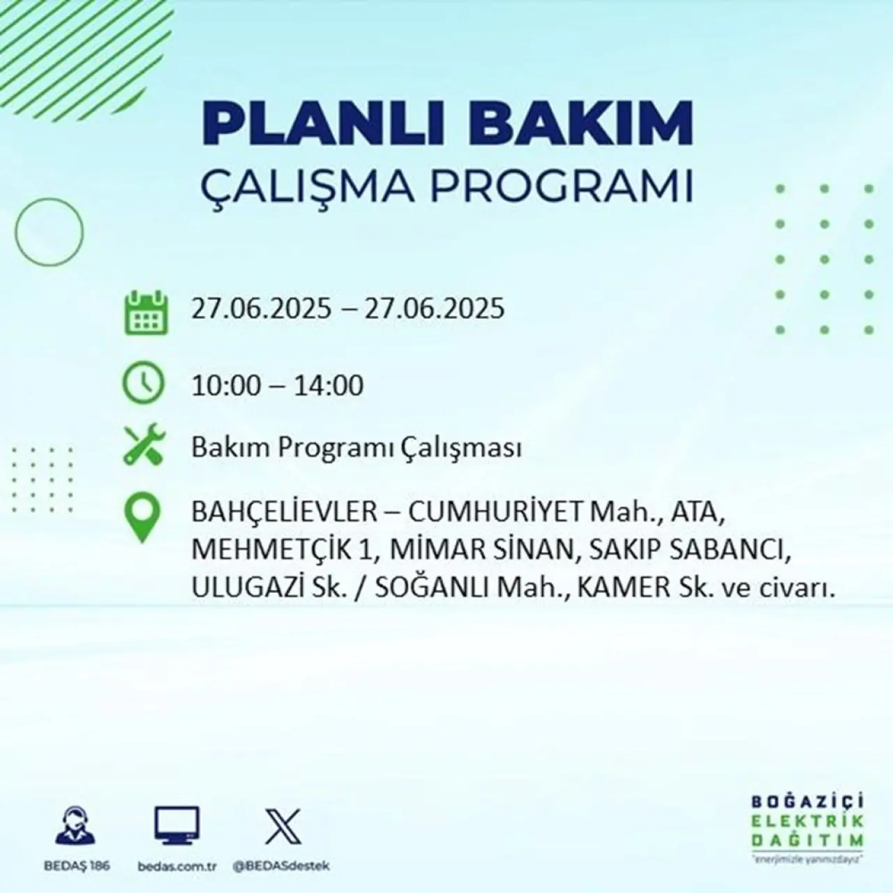 BEDAŞ'ın resmi internet sitesinde yayımlanan duyuruya göre, 27 Haziran Cuma günü sabah saatlerinden itibaren farklı ilçelerde elektrikler aşamalı olarak kesilecek. Bazı bölgelerde kesintiler saat 09.00’da başlayacak ve 17.00’ye kadar sürecek. Kesintiler, bakım ve onarım çalışmaları nedeniyle uygulanıyor.