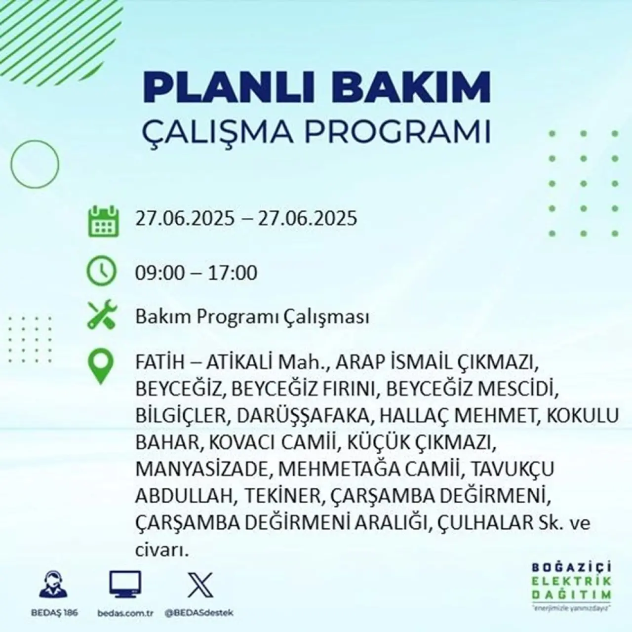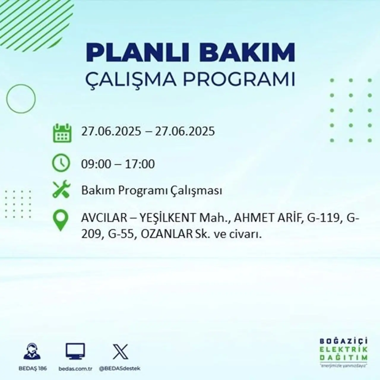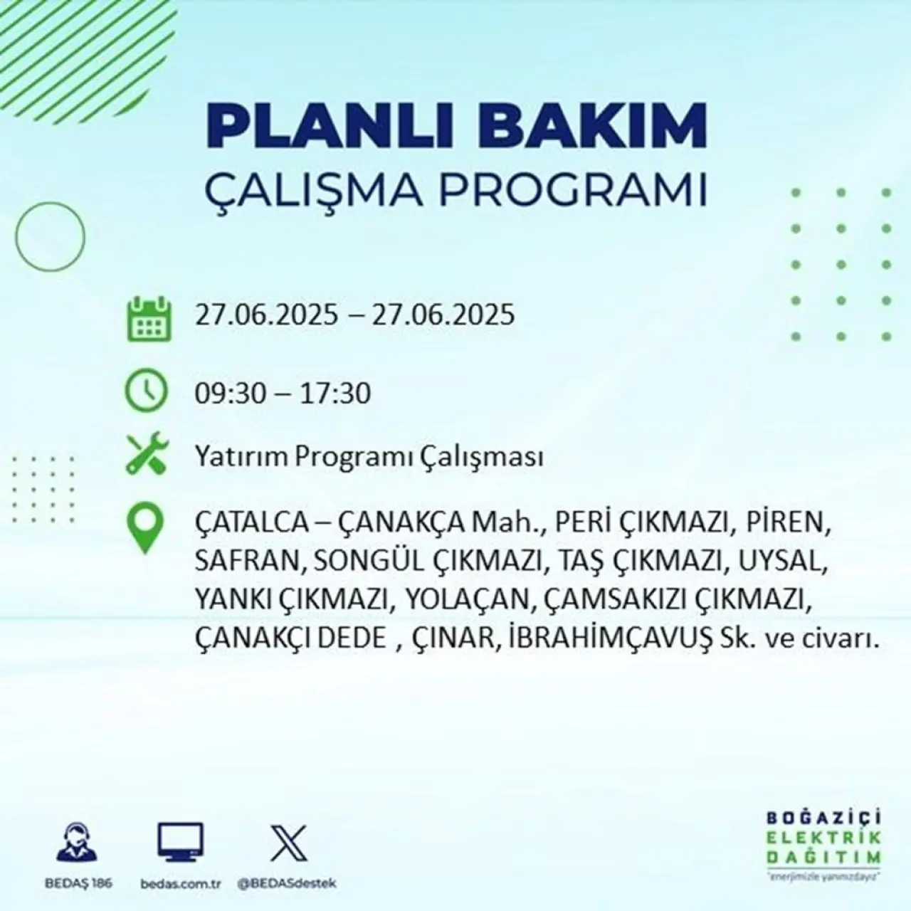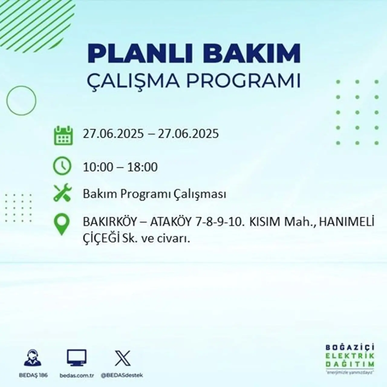 BEDAŞ'ın resmi internet sitesinde yayımlanan duyuruya göre, 27 Haziran Cuma günü sabah saatlerinden itibaren farklı ilçelerde elektrikler aşamalı olarak kesilecek. Bazı bölgelerde kesintiler saat 09.00’da başlayacak ve 17.00’ye kadar sürecek. Kesintiler, bakım ve onarım çalışmaları nedeniyle uygulanıyor.