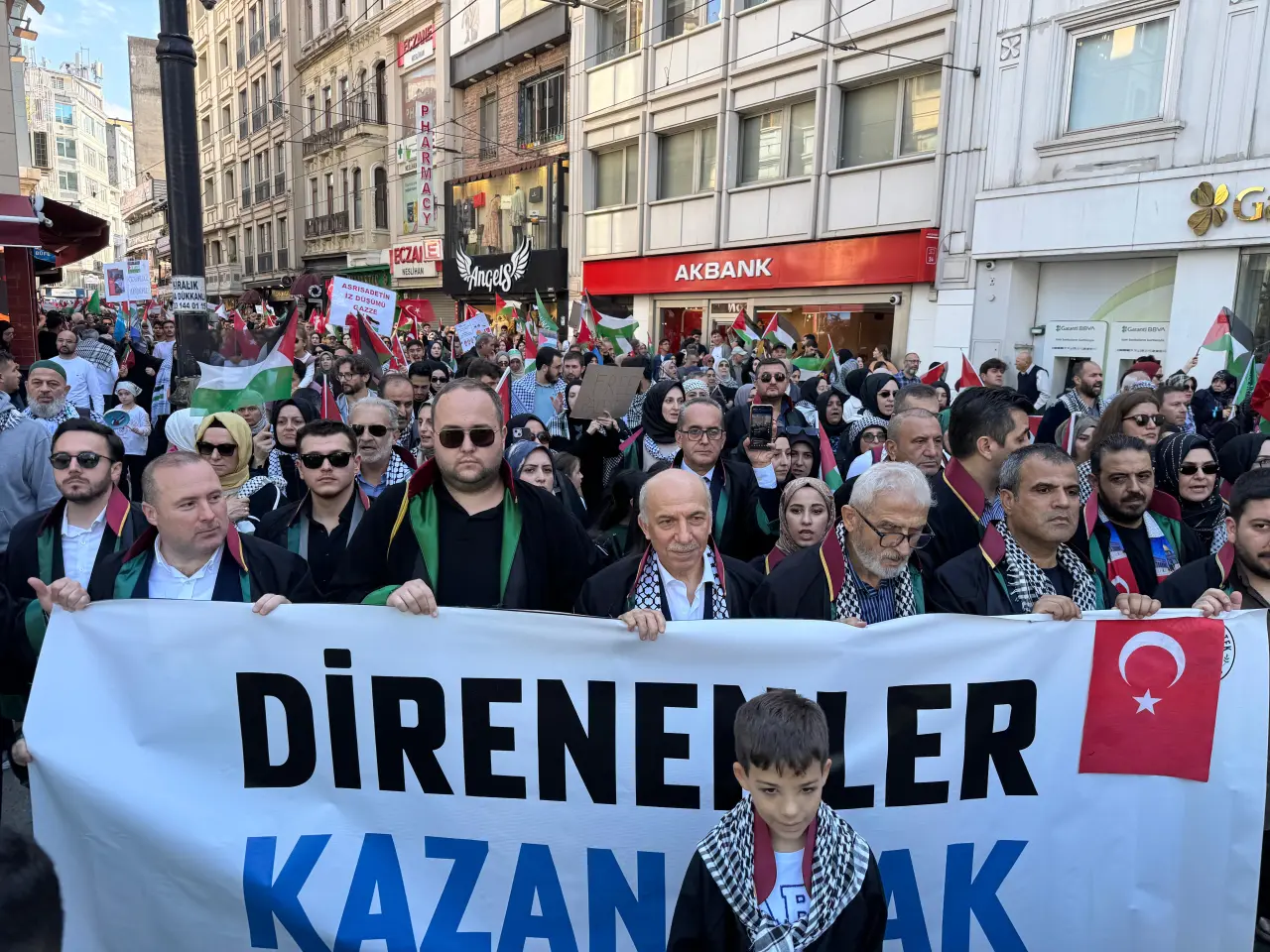 Cübbeleriyle en ön safta yer alan avukatlar ve kanaat önderleri, Filistin’e destek için yürüyüşe katıldı. Kefiyeler, bayraklar ve sloganlarla İstanbul sokaklarında güçlü bir dayanışma mesajı verildi.