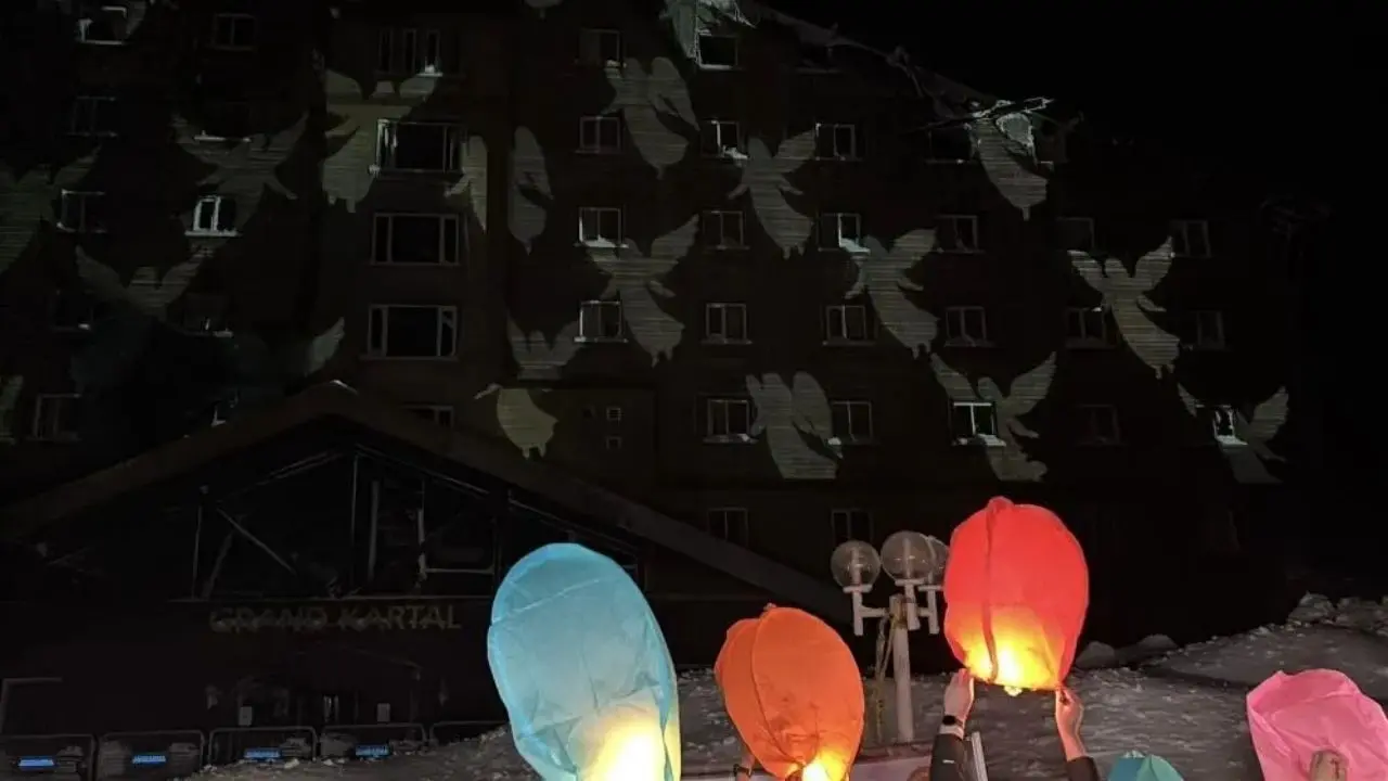 Gece yarısı hava sıcaklığının sıfırın altına düştüğü Kartalkaya’da, aileler saatler 03.17’yi gösterdiğinde otel binasının önünde toplandı. Duygusal anların yaşandığı anmada, hayatını kaybedenlerin isimleri ve onları temsilen melek sembolleri projeksiyonla otelin duvarına yansıtıldı. Aileler, kaybettikleri çocukları, eşleri ve kardeşleri için gökyüzüne dilek fenerleri bıraktı.