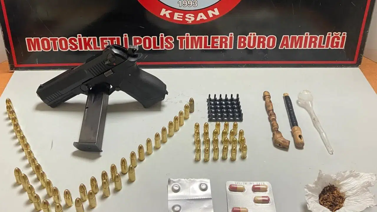 Edirne'nin Keşan ilçesinde polis, park halindeki araçta ve araçtaki bir şüphelinin üzerinde ruhsatsız tabanca, 64 mermi ve uyuşturucu ele geçirildi.