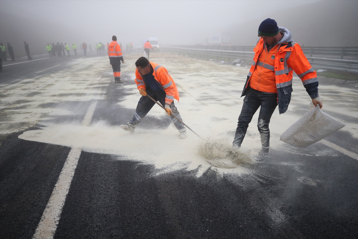 Kaza nedeniyle otoyolun İstanbul yönünde ulaşım durdu. Ekipler, yoğun sisin etkili olduğu bölgede araçları yoldan kaldırmak için çalışma yürüttü.