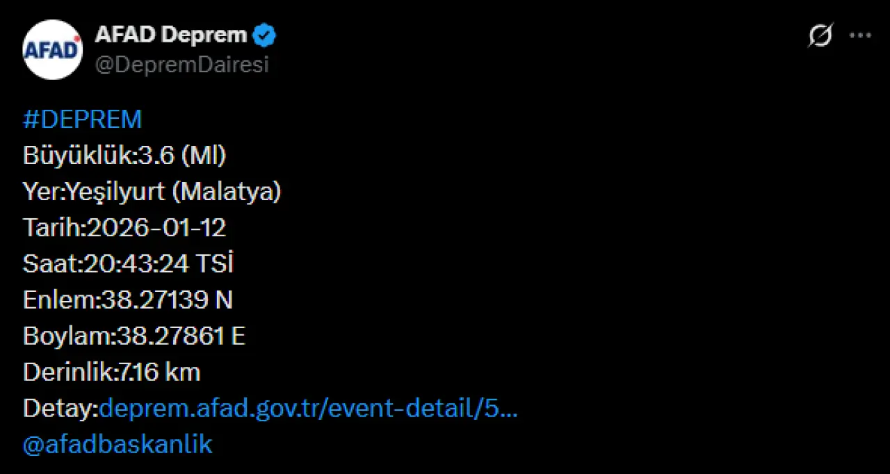 Afet ve Acil Durum Yönetimi Başkanlığı (AFAD) tarafından yapılan açıklamaya göre, saat 20.43 sıralarında Malatya Yeşilyurt'ta 3.6 büyüklüğünde bir deprem meydana geldi.