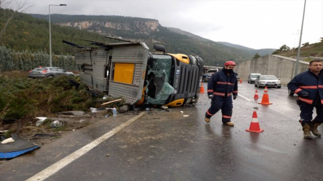 Aziz Badur'un kullandığı 33 ACD 719 plakalı tır, yağmurun etkili olduğu Manisaİzmir kara yolundaki Sabuncubeli tünelleri çıkışında devrildi.