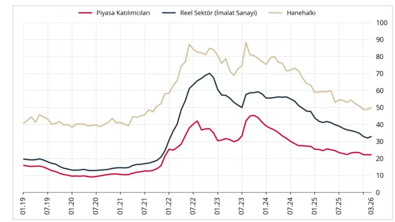2026 yılı Mart ayında 12 ay sonrası yıllık enflasyon beklentileri bir önceki aya göre, piyasa katılımcıları için 0,07 puan artarak yüzde 22,17 seviyesine, reel sektör için 0,90 puan artarak yüzde 32,90 seviyesine, hane halkı için 1,08 puan artarak yüzde 49,89 seviyesine yükseldi.
