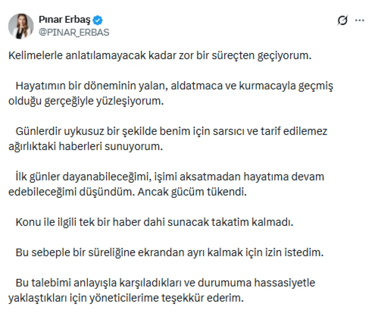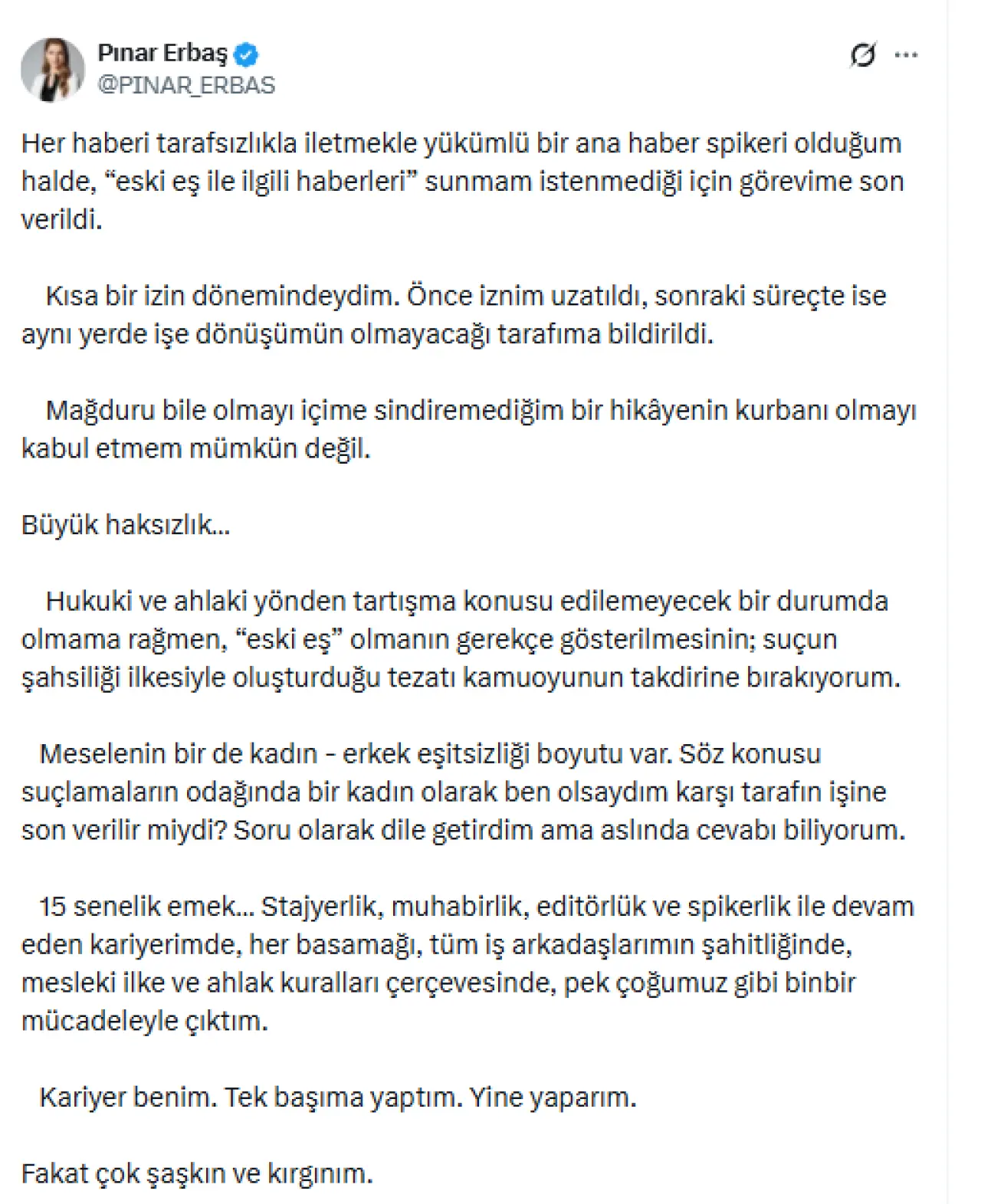 Pınar Erbaş, işten çıkarılma sürecini sosyal medya üzerinden kamuoyuyla paylaştı. Ersoy'un tutuklanması sonrası kısa bir izin dönemine ayrıldığını, ancak sonrasında işe dönüşünün engellendiğini belirten ünlü spiker, şu ifadeleri kullandı: