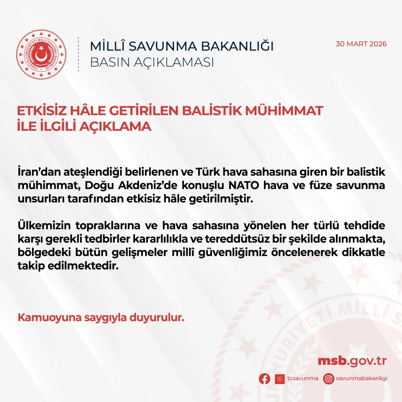 "İran’dan ateşlendiği belirlenen ve Türk hava sahasına giren bir balistik mühimmat, Doğu Akdeniz’de konuşlu NATO hava ve füze savunma unsurları tarafından etkisiz hâle getirilmiştir. Ülkemizin topraklarına ve hava sahasına yönelen her türlü tehdide karşı gerekli tedbirler kararlılıkla ve tereddütsüz bir şekilde alınmakta, bölgedeki bütün gelişmeler millî güvenliğimiz öncelenerek dikkatle takip edilmektedir."