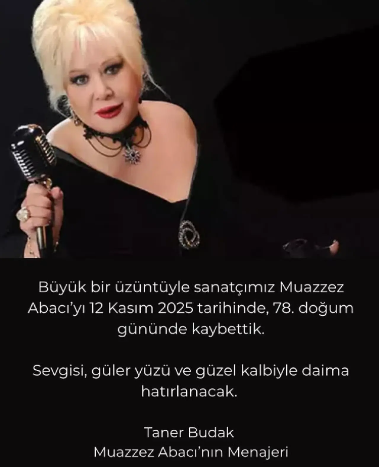 Türk sanat müziğinin usta isimlerinden Muazzez Abacı, kalp rahatsızlığı nedeniyle hastaneye kaldırılmasının ardından 78’inci doğum gününde yaşamını yitirdi. Acı haberi sanatçının menajeri Taner Budak sosyal medya üzerinden duyurdu.