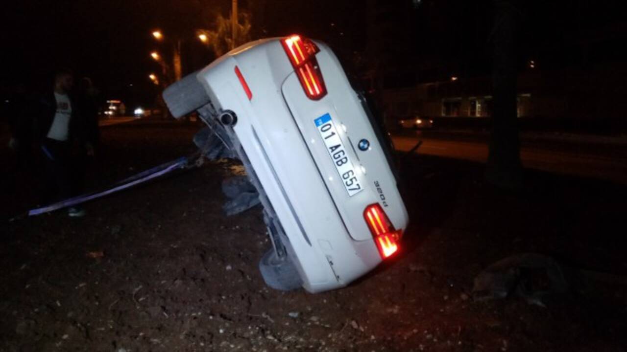 Türkmen Başı Bulvarı'nda Mehmet A yönetimindeki 01 AGB 657 plakalı otomobil, kaldırama çarpıp savrularak çıktığı refüjde ters döndü.