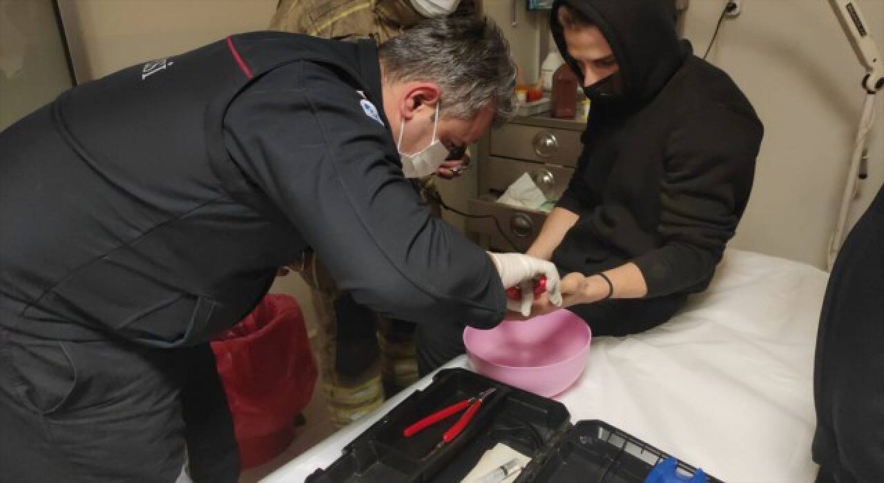 A.K, parmağında sıkışan yüzüğü çıkartamayınca İnegöl Devlet Hastanesi'ne geldi. Burada yapılan ilk müdahalenin ardından hastane yetkilileri, itfaiye ekiplerine haber verdi.
