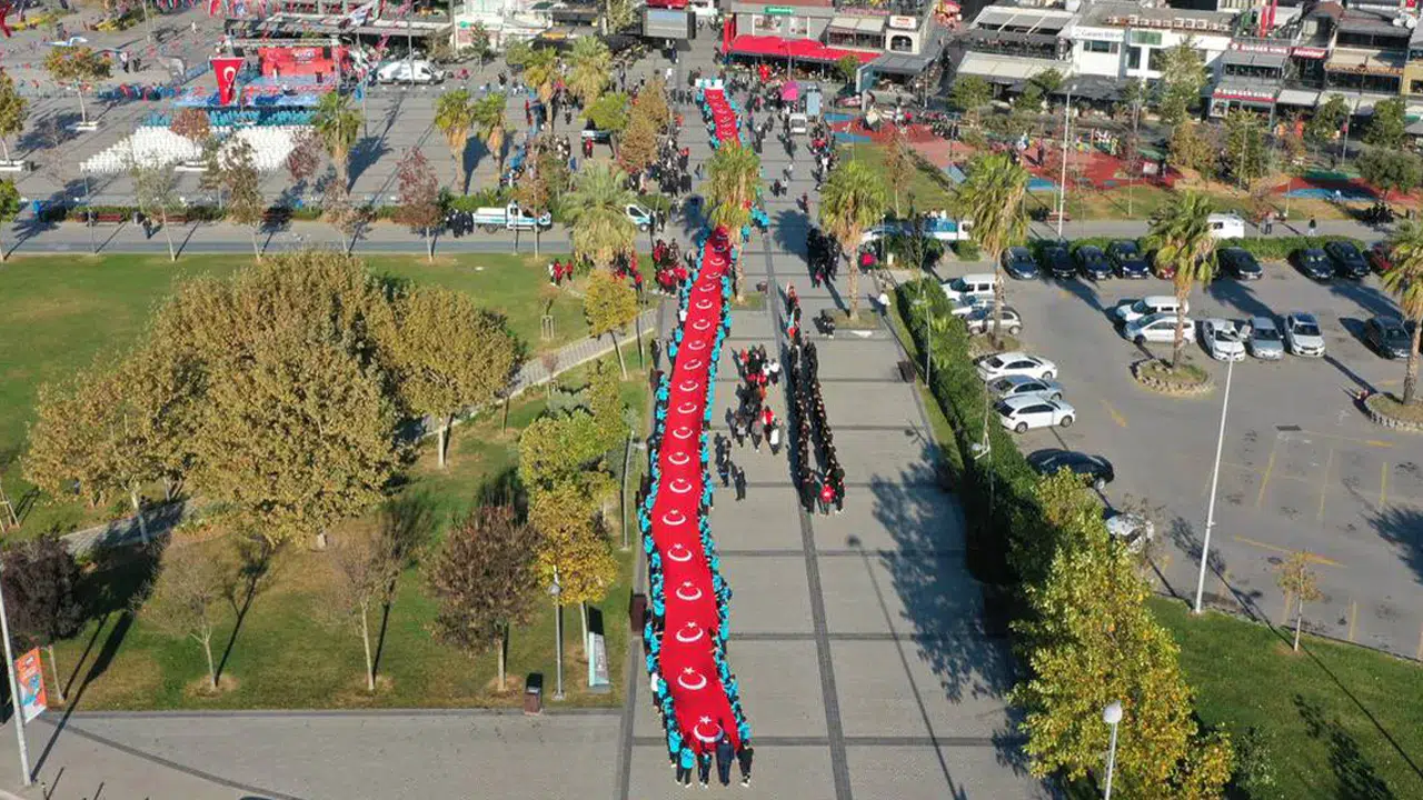Pendik'te Cumhuriyet'in 102. yılı coşkusu 102 metrelik dev Türk bayraklı yürüyüşle kutlandı. Dev Türk bayraklı kutlama havadan görüntülenirken, yürüyüşe Pendik Belediye Başkanı Ahmet Cin, Pendik Kaymakamı Mehmet Yıldız ve yüzlerce öğrenci ve vatandaş katıldı.