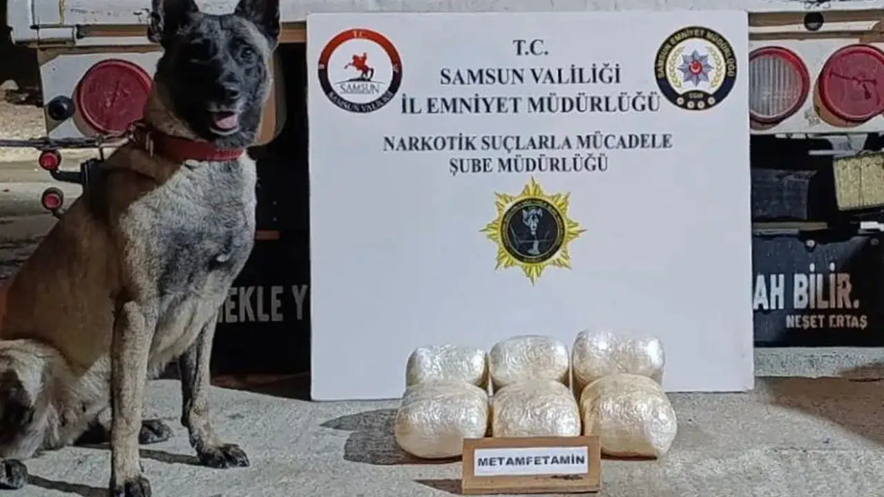 Samsun'da kamyonete gizlenmiş uyuşturucuyu narkotik dedektör köpeği Şila bulurken, 4 kilo 975 gram metamfetamin ve 4 bin 840 adet extacy hap ele geçirildi.