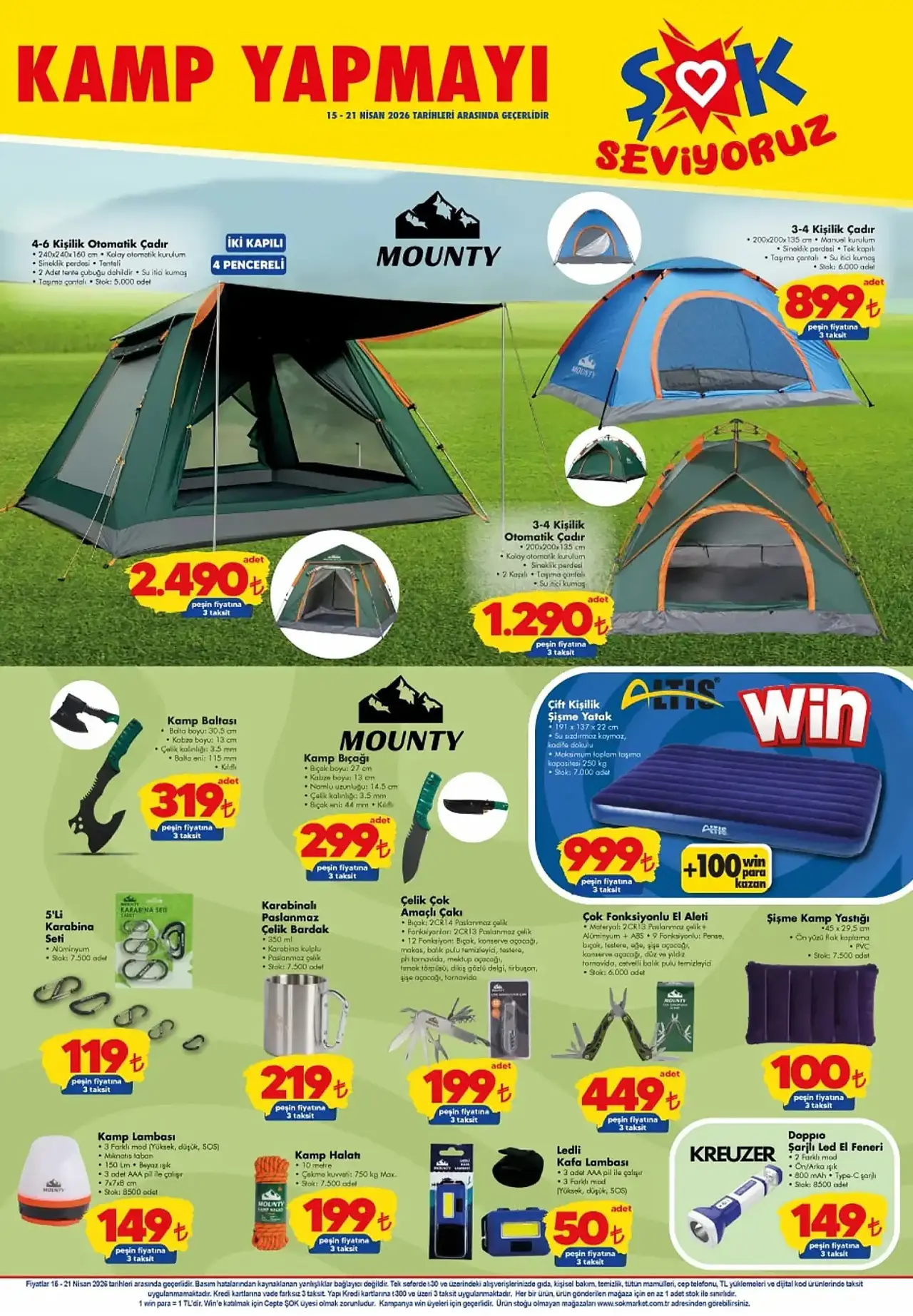 ŞOK 15 Nisan kataloğu sadece teknolojiyle sınırlı kalmayıp baharın gelişini de kutluyor. Mounty otomatik çadırlar, XL kamp sandalyeleri ve kamp tabureleri doğaseverlerin beğenisine sunuldu. Piknik keyfi için Akel Şişli Ocakbaşı kapaklı ızgara, Buzzy 20 litre termos ve çeşitli termal çantalar açık hava aktivitelerini konforlu hale getirmeyi hedefliyor.