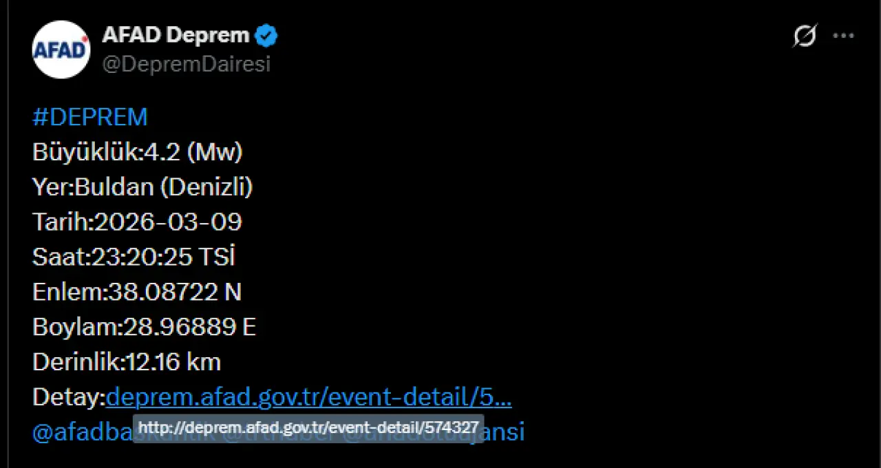 Denizli'de hissedilen bir deprem meydana geldi. Afet ve Acil Durum Yönetimi Başkanlığı (AFAD) tarafından yapılan son açıklamaya göre, saat 23.20 sıralarında merkez üssü Denizli'nin Buldan ilçesi olan 4.2 büyüklüğünde bir deprem meydana geldi.