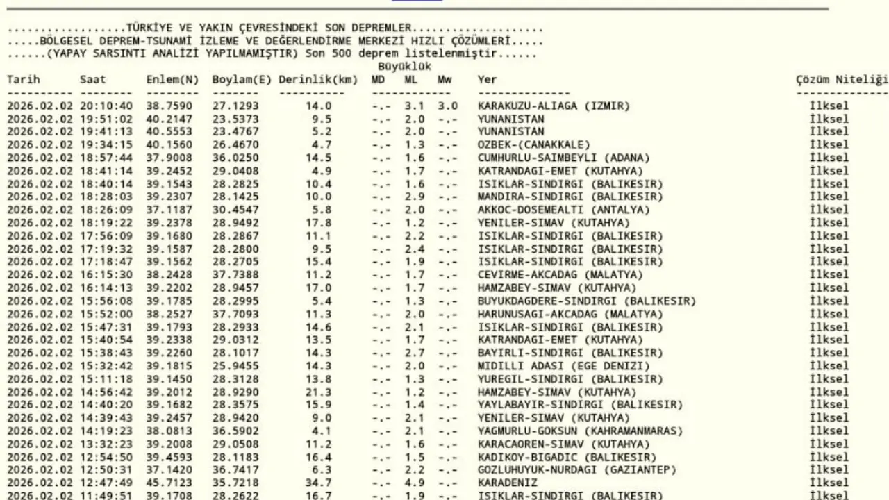 İzmir'de deprem oldu. Kandilli Rasathanesi'nin resmi internet sitesinden yayınlanan son depremler listesine göre, saat 20.10 sıralarında merkez üssü Karakuzu-Aliaga (İzmir) olan 3.1 büyüklüğünde bir deprem meydana geldi. Deprem, yerin 14 kilometre derinliğinde gerçekleşti.