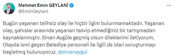 "Bugün yaşanan talihsiz olay ile hiçbir ilgim bulunmamaktadır. Yaşanan olay, şahıslar arasında yaşanan tasvip etmediğmiz bir tartışmadan kaynaklanmıştır. Sinan Aygüle geçmiş olsun dileklerimi iletiyorum. Olayda ismi geçen Belediye personeli ile ilgili de idari soruşturmayı başlatmış bulunuyoruz."