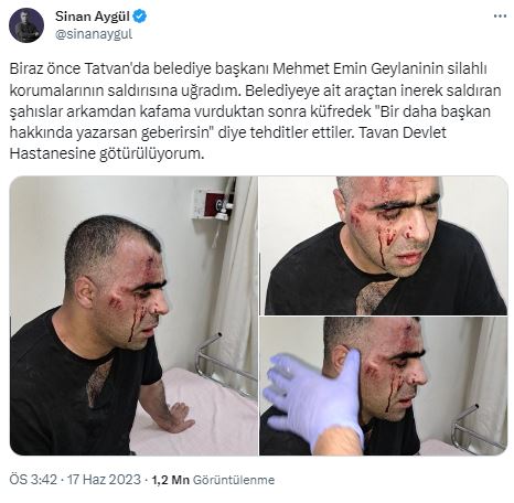 "Biraz önce Tatvan'da belediye başkanı Mehmet Emin Geylaninin silahlı korumalarının saldırısına uğradım. Belediyeye ait araçtan inerek saldıran şahıslar arkamdan kafama vurduktan sonra küfredek 'Bir daha başkan hakkında yazarsan geberirsin' diye tehditler ettiler. Tatvan Devlet Hastanesine götürülüyorum."