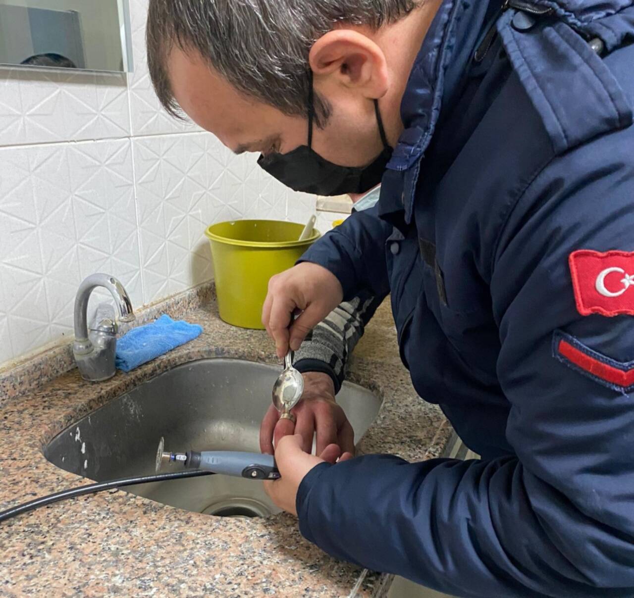 İhbarı alan itfaiye ekipleri, hastaneye gelerek yüzüğü çıkartmak için çalışma başlattı.