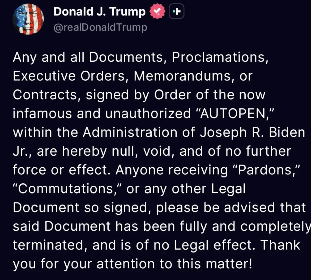 ABD Başkanı Donald Trump, selefi Joe Biden döneminde "Autopen" (imza makinesi) ile imzalanmış tüm belgelerin artık geçersiz olduğunu belirterek, "Af, ceza indirimi veya bu şekilde imzalanmış başka bir belge alan herkes, söz konusu belgenin hiçbir yasal etkisinin olmadığını unutmamalıdır" açıklamasında bulundu.