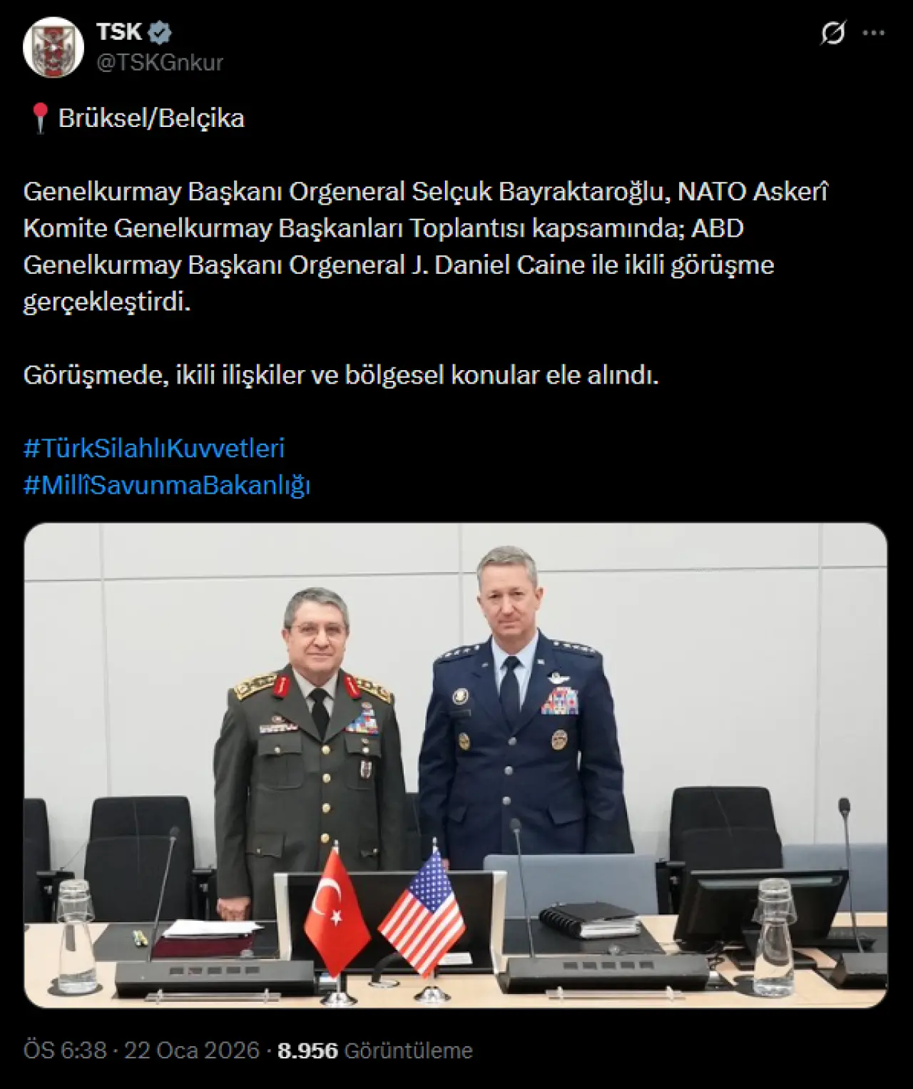Türk Silahlı Kuvvetleri'nin (TSK) sosyal medya hesabından görüşmeye dair yapılan paylaşımda, "Genelkurmay Başkanı Orgeneral Selçuk Bayraktaroğlu, NATO Askeri Komite Genelkurmay Başkanları Toplantısı kapsamında, ABD Genelkurmay Başkanı Orgeneral John Daniel Caine ile ikili görüşme gerçekleştirdi. Görüşmede, ikili ilişkiler ve bölgesel konular ele alındı'' ifadelerine yer verildi. Paylaşımda, görüşmeye dair fotoğraflarda yer aldı.