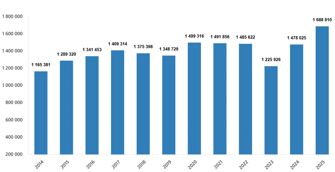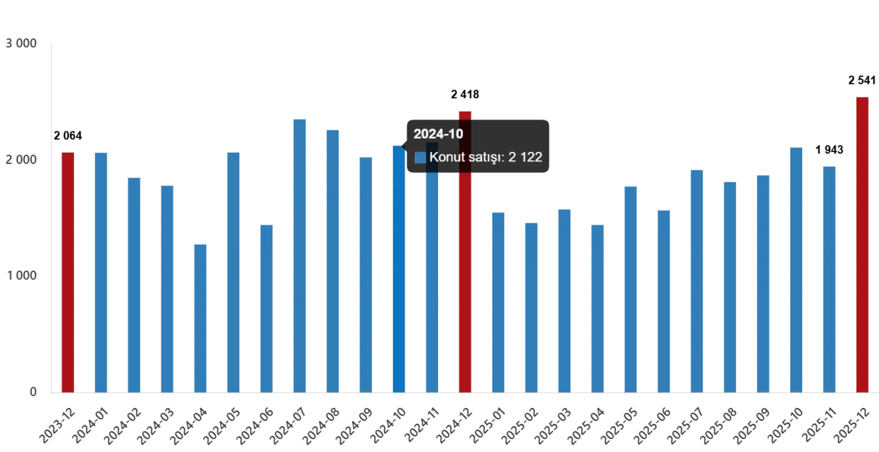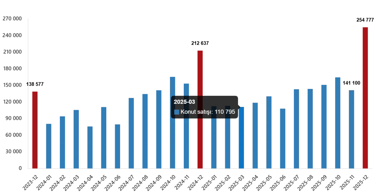 Tükiye İstatistik Kurumu, Aralık 2025 konut satış istatistiklerini açıkladı. Türkiye genelinde konut satışları 2025 yılında bir önceki yıla göre %14,3 oranında artarak 1 milyon 688 bin 910 oldu.