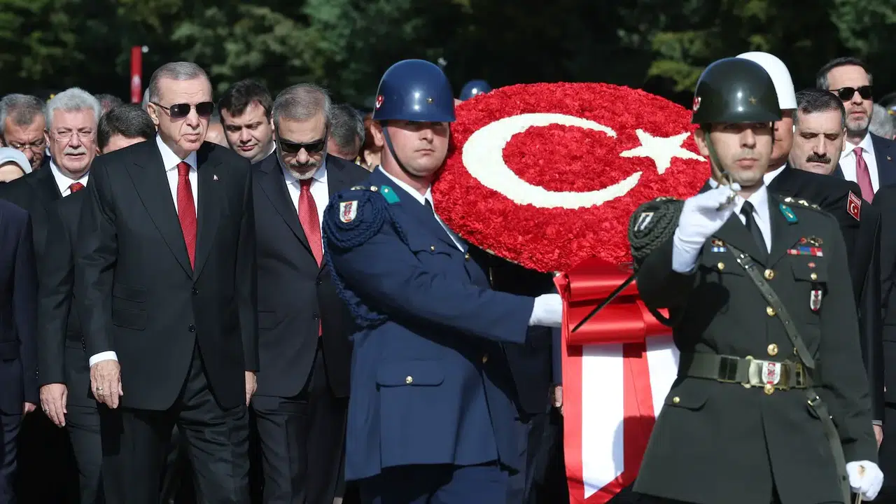Cumhurbaşkanı Erdoğan, Anıtkabir’de Atatürk’ün mozolesine üzerinde ay-yıldız bulunan çelengi bıraktı. Ardından saygı duruşunda bulunuldu ve İstiklal Marşı hep bir ağızdan okundu. Tören, Erdoğan ve beraberindekilerin Misak-ı Milli Kulesi’ne geçmesiyle devam etti.