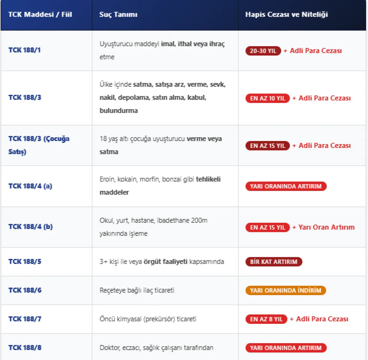 Türk Ceza Kanunu’nun 188. maddesi, uyuşturucu veya uyarıcı maddenin imal edilmesi, satılması, sevk edilmesi, depolanması ve ticaretinin yapılmasını ağır suç olarak düzenler. Bu madde, toplum sağlığını koruma amacıyla yüksek hapis cezaları öngörür.