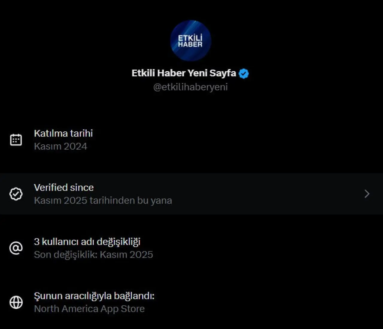 Kasım 2024’te açıldığı halde Kasım 2025 itibarıyla doğrulama rozeti aldığı anlaşılan yeni hesabın, profil bilgilerine göre 3 farklı kullanıcı adı kullandığı belirlendi. Kullanıcı adı değişikliklerinin kısa süre aralıklarla yapılması dikkat çekti.