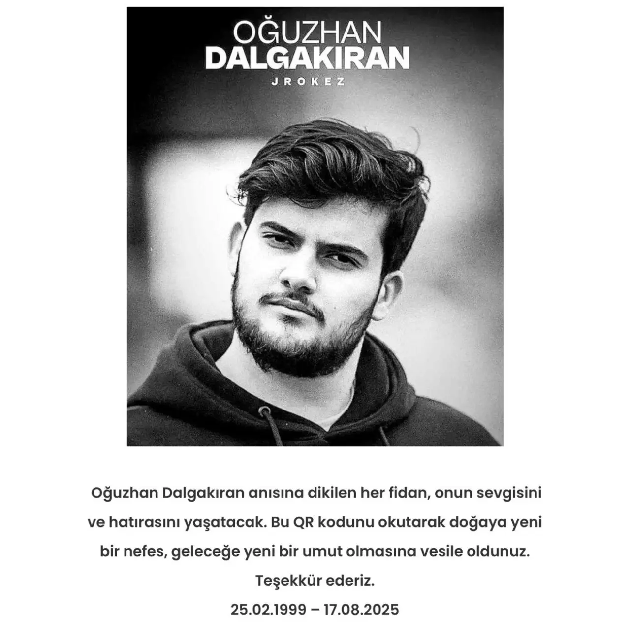 Geçtiğimiz günlerde 12. kattan düşerek hayatını kaybeden Oğuzhan Dalgakıran. Bugün son yolculuğuna uğurlandı. Yayıncı Jrokez'un cenazesinde, yaka fotoğraflarının arkasına fidan bağışı yapılabilmesi için QR kod eklendi.